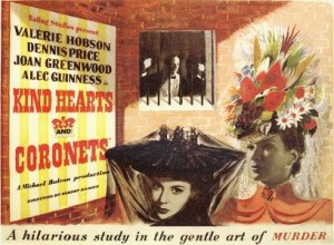 Oh and one last thing: I have to point you in the direction of this charming art project, which I found while writing this post. The student had the brilliant idea of recreating the Kind Hearts and Coronets film poster in the form of a Cluedo board (that’s Clue for our American readers, although apparently we don’t have any (see last week’s podcast)). I suppose the downside is there’s only one suspect – Louis Mazzini – but you could have a lot of fun with the murder weapons: “Was it Louis Mazzini in the Billiard Room with the hot air balloon?”
